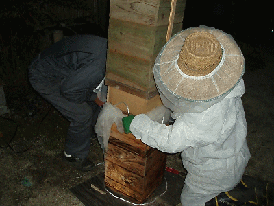 日本蜜蜂ハチミツを取るため、日本蜜蜂の採蜜を行いました。まずは巣箱の新しい巣箱を隙間の無いように重なるように置き、ゆっくりひっくり返します。今度は、古い箱の下側の横を、軽くたたき日本蜜蜂を上にある新しい巣箱に移動してもらいます。
