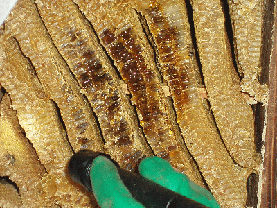 これが、日本蜜蜂の巣箱の中の日本蜜蜂ハチミツが入っている巣屋になります。今年は、花の数が少なかったのか、蜂蜜の量が非常に少なくほとんど空の状態でした。
