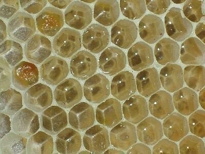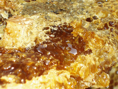 光り輝いているのが日本蜜蜂ハチミツになります。まっ黄色の粉っぽいところは、おそらく日本蜜蜂が集めた花の花粉だと思います。
