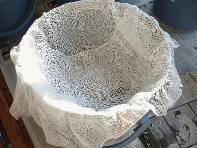 今度はいよいよ日本蜜蜂ハチミツの採蜜に入ります。まずは熱湯で消毒して、奇麗に乾かした笊とバケツとガーゼを用意します。このガーゼの上に日本ミツバチの巣屋を置き温度をかけ、日本蜜蜂ハチミツを垂らします。
